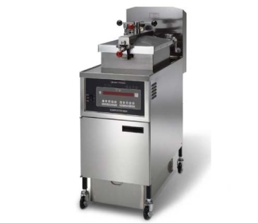 Pressure fryers are most commonly associated with fried chicken restaurants. Coated chicken pieces are lowered into the fry tank and a lid closed and locked into place to form an airtight seal. Moisture is immediately released from the food which rapidly builds up the air pressure. The pressure causes rapid tumbling of the food and transfers heat faster from hot oil to the food. Pressure has the effect of increasing the temperature of the food and oil and because the heat transfer is faster than in a normal fryer, the frying temperature is higher than in a normal deep-fat fryer. A further effect of the pressure is to rapidly seal the outside of the chicken, keeping moisture in and excess grease out. This along with the flavour coating is what makes southern-style fried chicken so crisp and moist compared to chicken cooked in a standard deep-fat fryer. Because it is not possible to inspect the food as it is being fried, the fryers are computer programmed according to the product being cooked. The programme can do multi-temperature cooking during the pressure cycle, to a rapid seal of the food at first, then a gentler cooking temperature. In a typical chicken operation, the start oil temperature will be 180 deg C for the first burst of heat to seal the chicken, then will lower to 145 deg C to cook the chicken safely through. Most pressure fryers have an automatic pressure release and audible signal at the end of the cooking cycle to tell the cook that the chicken is finished. More advanced models will also have automated basket lift. Pressure fryers have in-built filtration systems and a cool spot to collect food debris from frying prior to filtration.